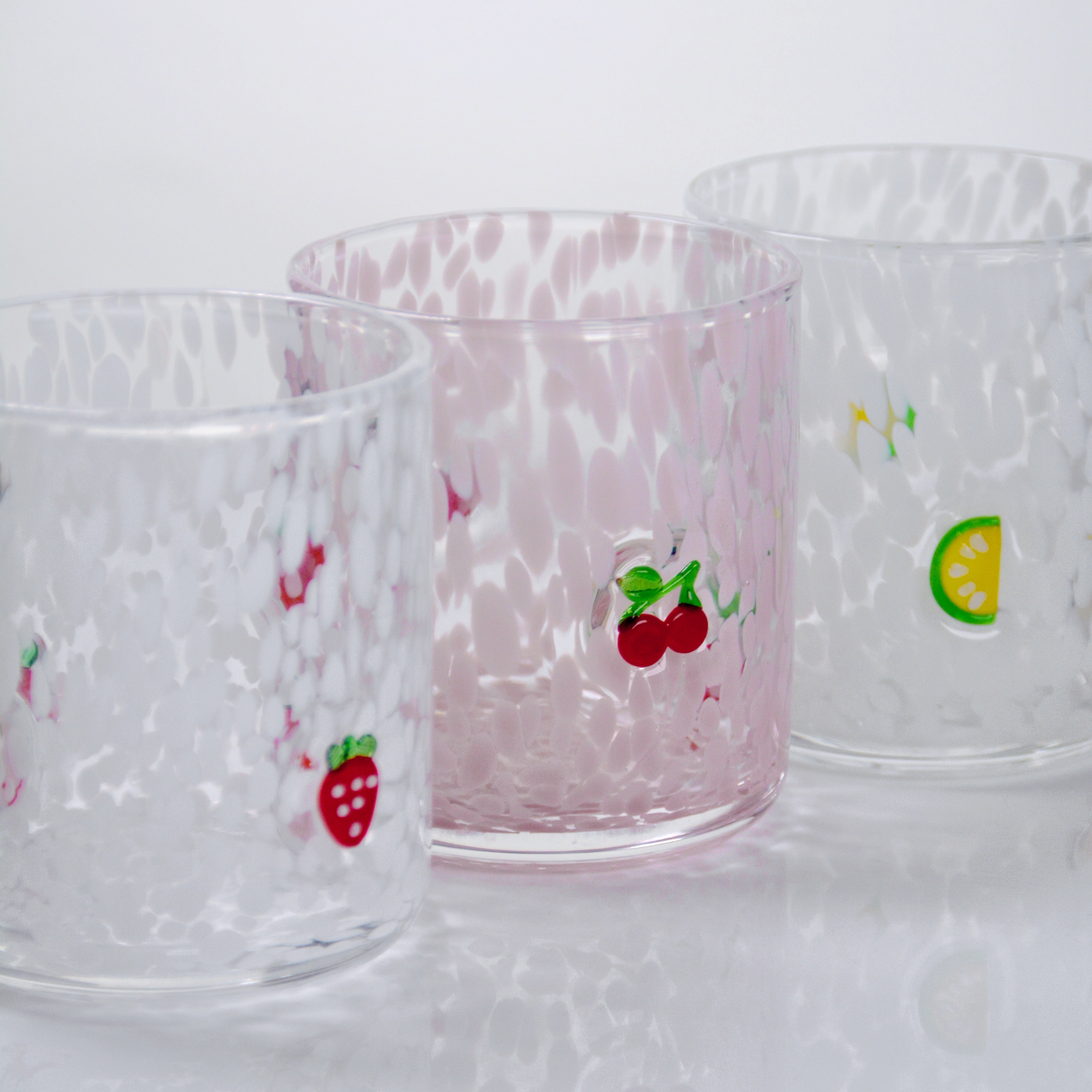 Αυτό το γοητευτικό γυαλί έχει ένα παιχνιδιάρικο μοτίβο φράουλας, ζωγραφισμένο στο χέρι σε ένα κρεβάτι από μαλακά, χιονισμένα κονφέτι.Ιδανικό για το πρωινό σου σμούθι., παγωμένο latte, ή ένα αναζωογονητικό ποτήρι ροζέ, προσθέτει μια δόση αθώας γλυκύτητας σε οποιοδήποτε ποτό.